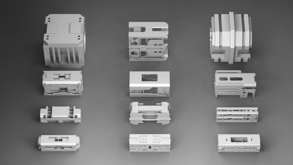 All assets are UV mapped, and constructed with non-subd topology. Note that the medium poly assets contain dense chamfers for rounded surfaces, but do not have fillets on hard edges. Since these objects have a lower level of detail, they are ideal for creating distant, complex environments, low resolution concepts, or remeshed sculpting bases. The high poly assets use a fillet on all hard edges to provide a smooth, high resolution edge—perfect for kitbashing a high resolution hard surface object.